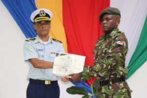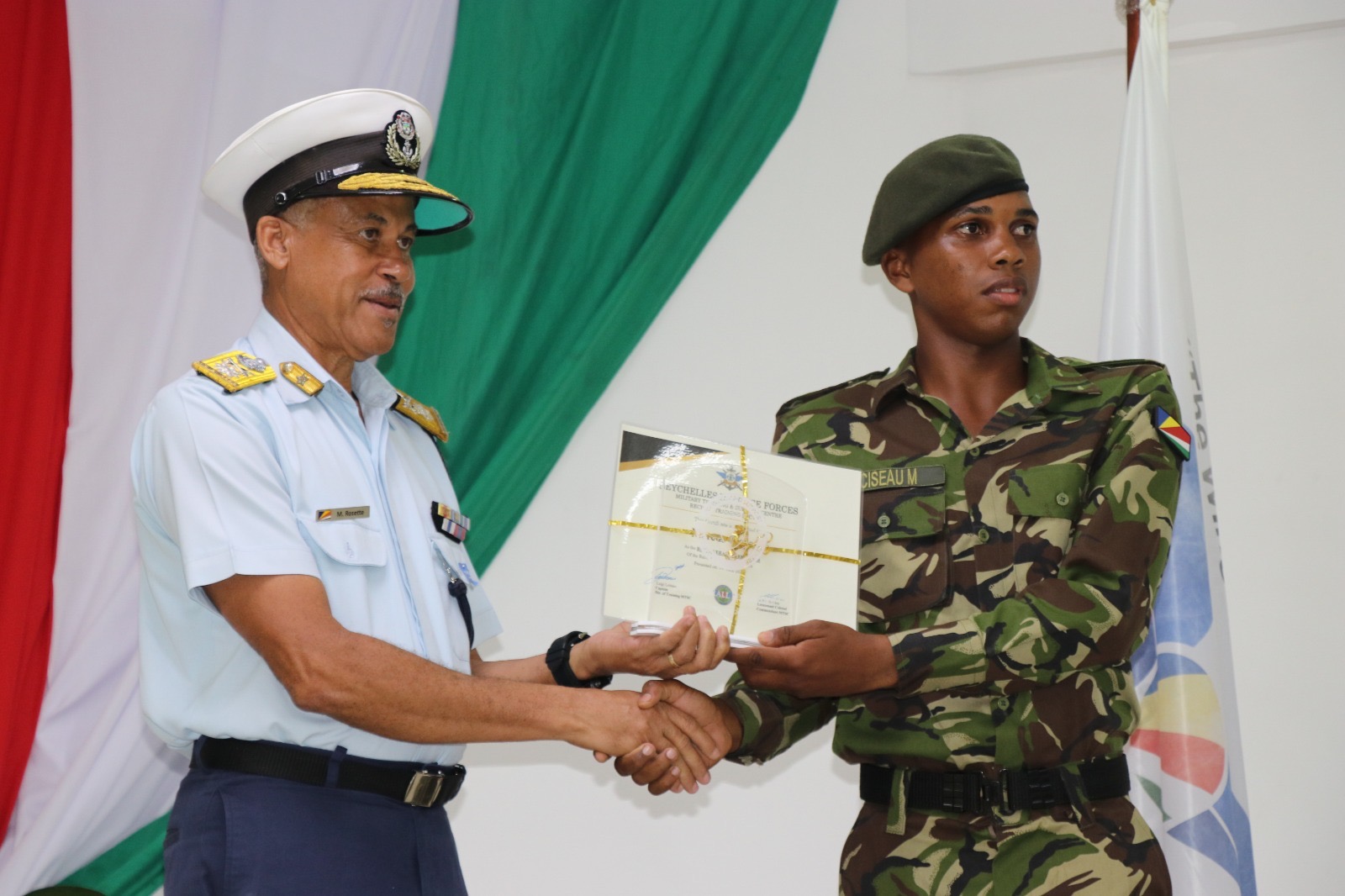 The ceremony was held  this afternoon at the Military Training Support CentreAuditorium- Ile Perseverance, in the presence of  Chairman of the Defence Comitee Honorable Clifford Andre,Chief of Defence Forces Brigadier Michael Rosette, senior SDF officers, and family members and friends of the new recruits.