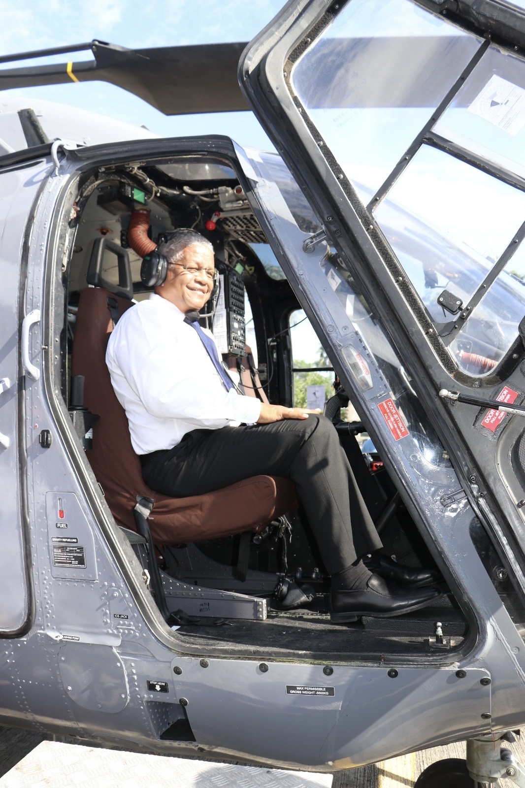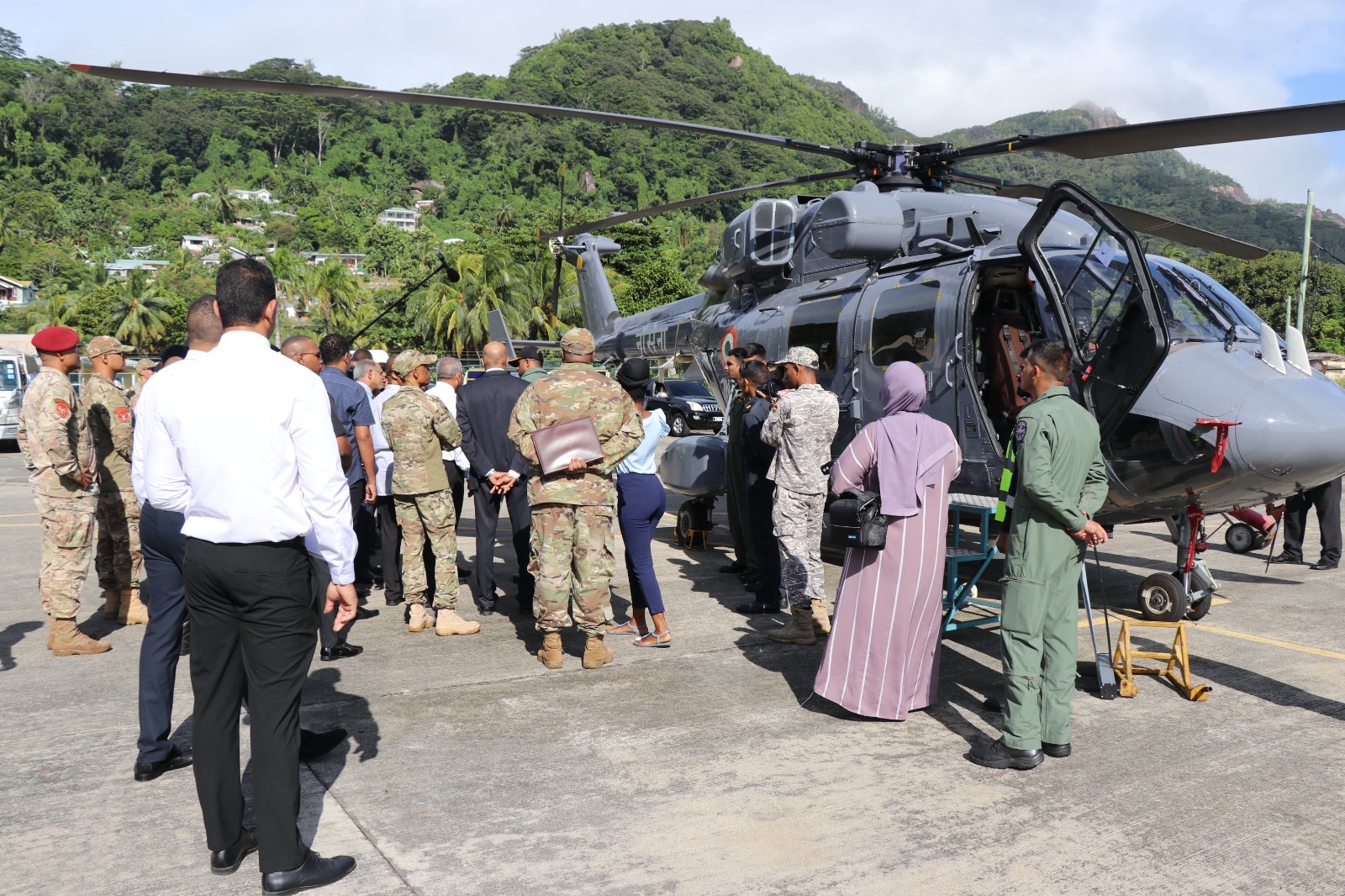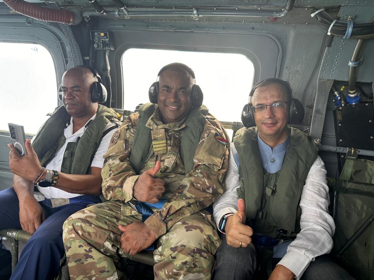 Commander In Chief President Wavel Ramkalawan and members of the Defence Forces Council visited the Advanced Light Helicopter-ALH today at the Seychelles Air Force base. This multi-mission multi-role helicopter can be used in a variety of military and civilian applications. The helicopter is one of the many assets on board the Indian Naval Ship Sunayna, which is currently in port to take part in the Independence Day activities. The Indian Navy took the opportunity to demonstrate the capabilities of the ALH.