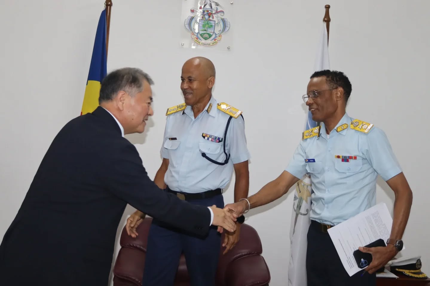 Mr. Sadamasa was accompanied by the Japanese Ambassador to Seychelles, H.E. Sakuta Makoto and Defence Attaché Commander Keiko Kawashima, who was undertaking her final visit to Seychelles in her current capacity.
