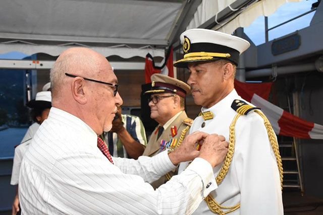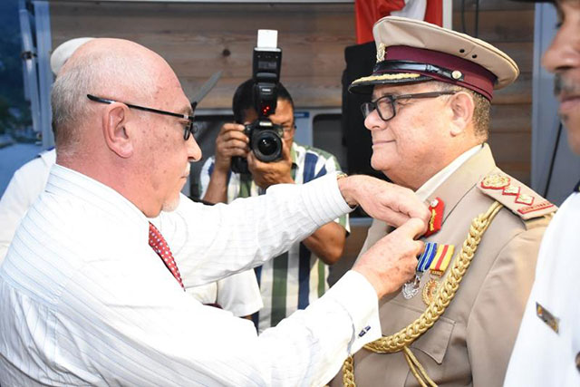(Seychelles News Agency) – Le colonel Clifford Roseline qui est le chef des Forces de défense des Seychelles et le colonel Michael Rosette chef d’État-major ont été décorés de la médaille de la défense nationale, par le gouvernement français. C’est l’ambassadeur de France aux Seychelles Lionel Majesté-Larouy, qui a remis cette décoration aux plus hauts officiers de l’armée seychelloise en présence du président des Seychelles Danny Faure. « C’est en particulier grâce à leur action quotidienne que nous avons aujourd’hui atteint ce haut niveau de coopération bilatérale » a dit l’Ambassadeur Majesté-Larouy.