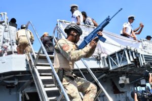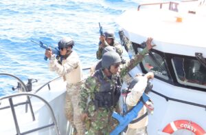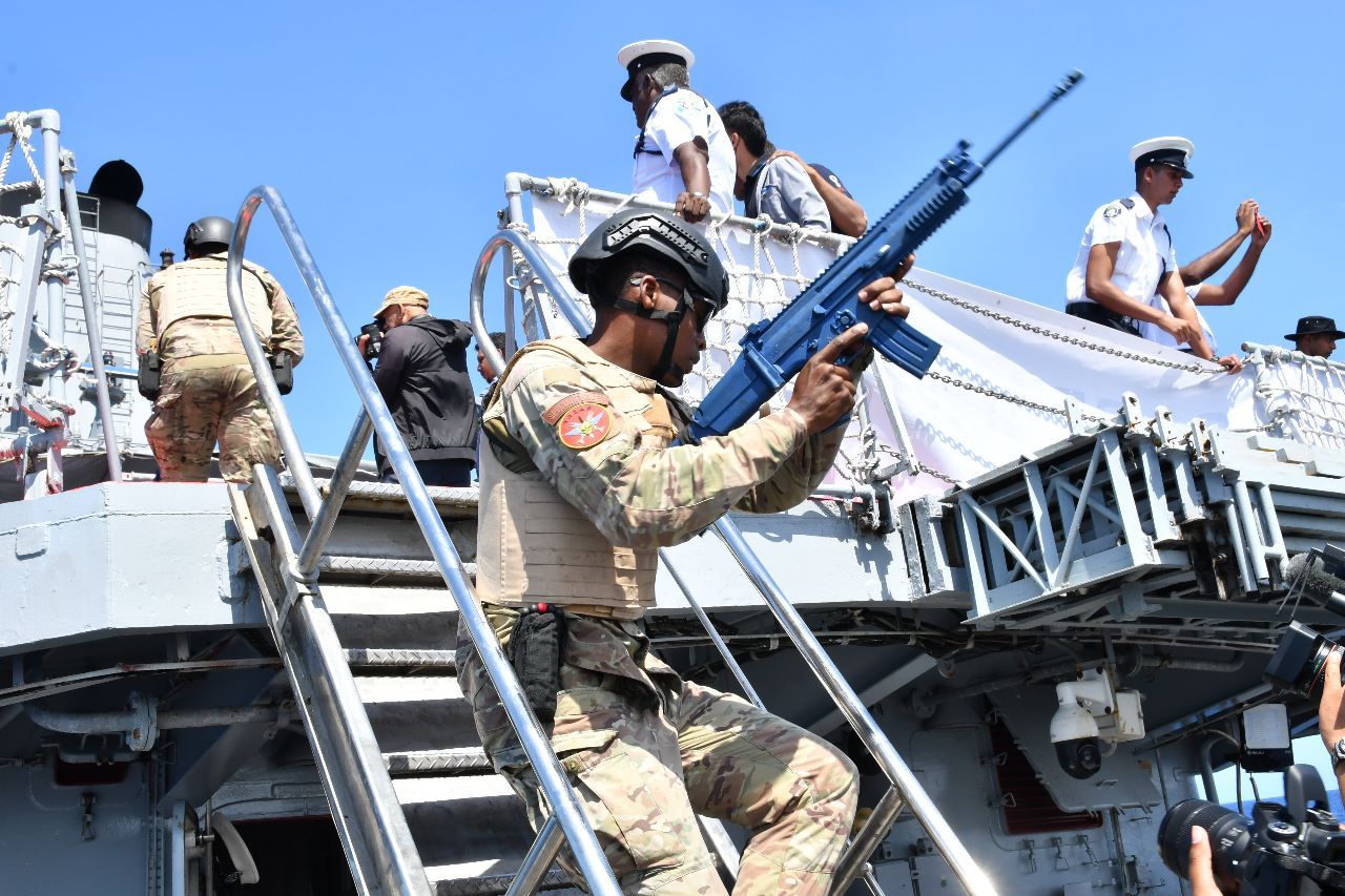 Pour ceux qui ne connaissent pas il s’agit d’une simulation orchestrée dans le cadre de la13eme edition du Cutlass Express, l’un des plus grands exercices d’entrainement naval organisé par le commandement Américain pour l’Afrique (Africom) dans l’Océan Indien. L’exercice s’est déroulé à Ile Maurice du 6 au 17 Mars 2023.