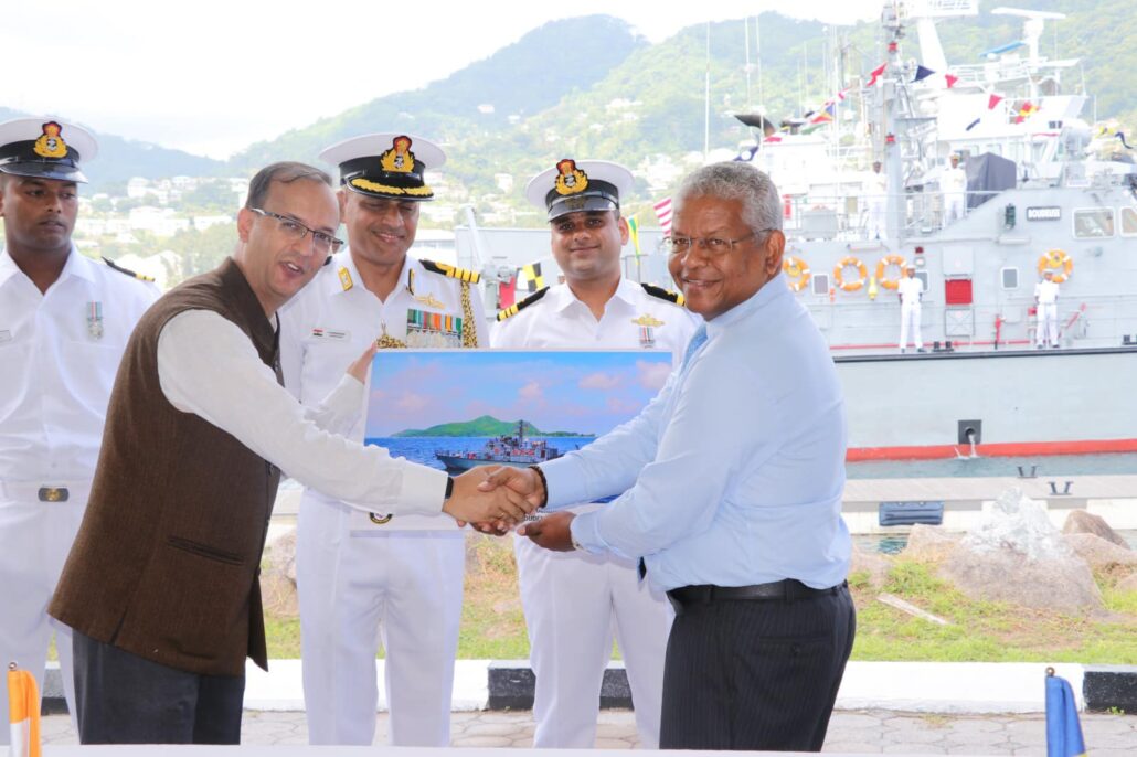 In a small ceremony this morning, the SDF Commisioned another vessel into its fleet. The ceremony was held at the Seychelles Coast Guards Base in the presence of the Commander In Chief President Wavel Ramkalawan, Vice President Mr. Ahmed Afif, Ambassador for India Mr. Kartik Pande, ministers, members of the Defence Force council and military personnel from both the SDF and Indian Armed Forces.
